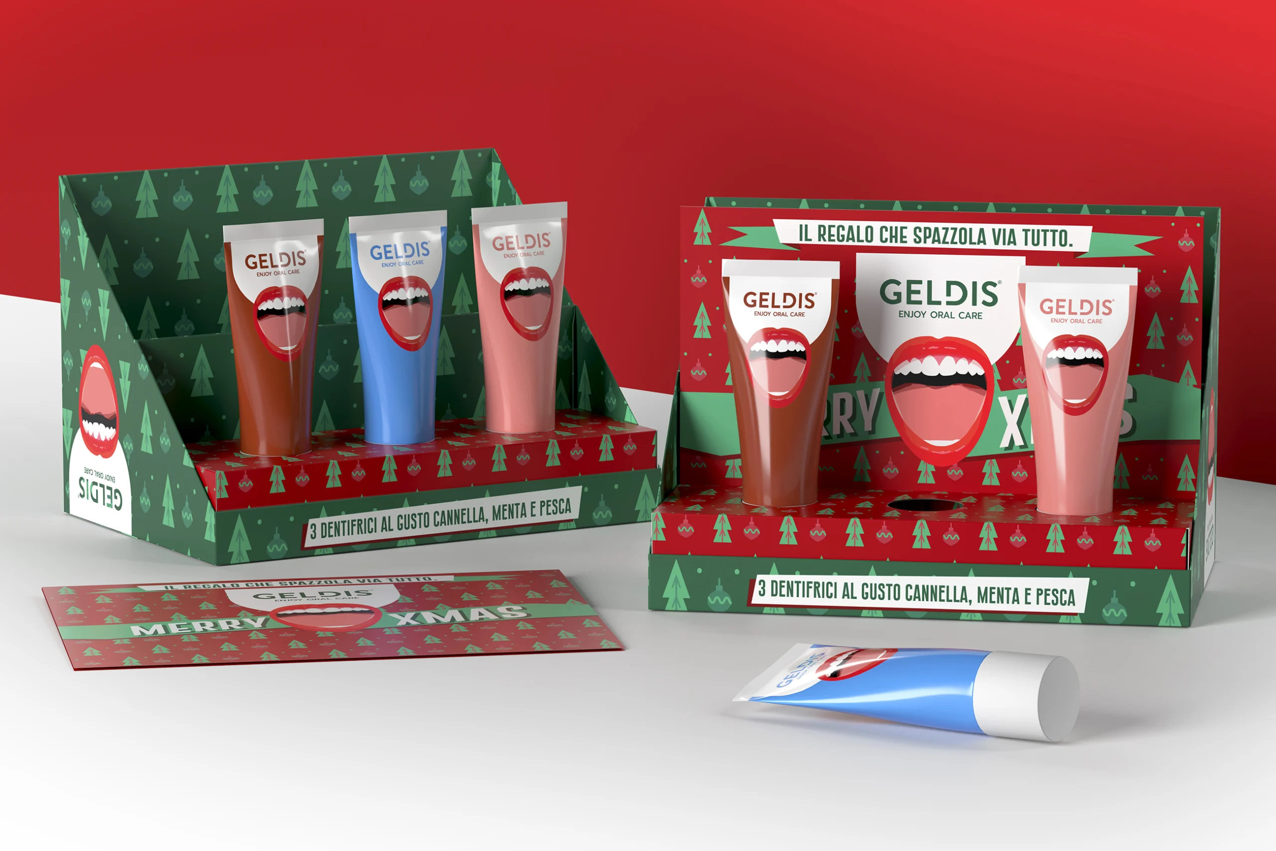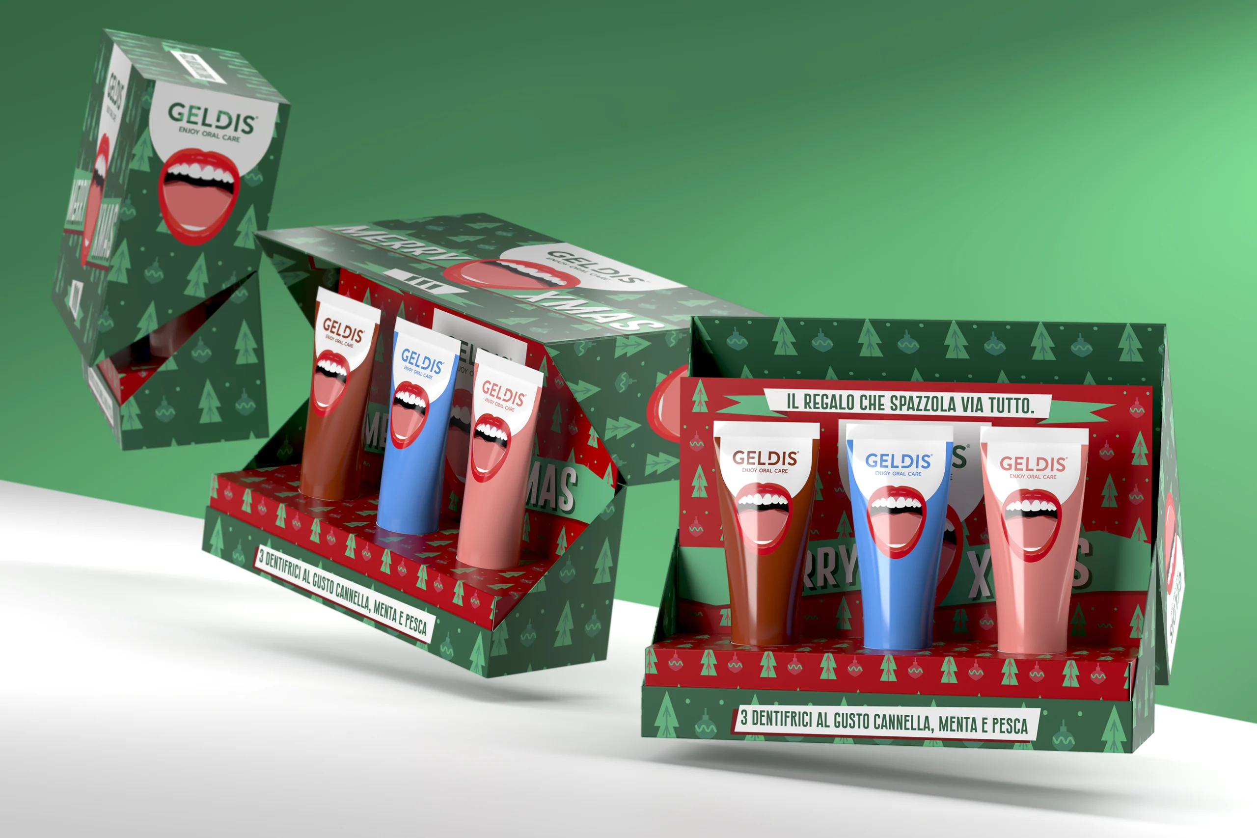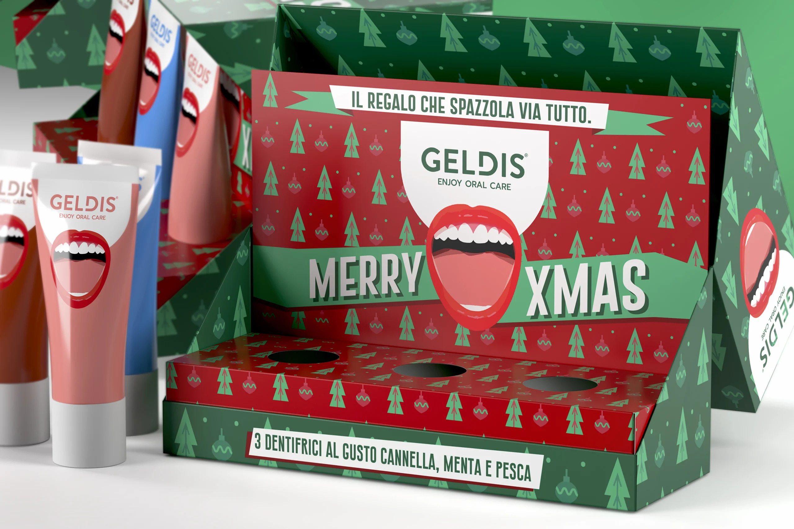 This is the second concept created for Geldis: a custom made box composed of two structures: an inner tray holding the product caps, and the the outer cover with front-opening design — a subtle nod to the gesture of an opening mouth — that breaks away from the conventions of the oral care world, borrowing instead from the language of luxury and high-end cosmetics.