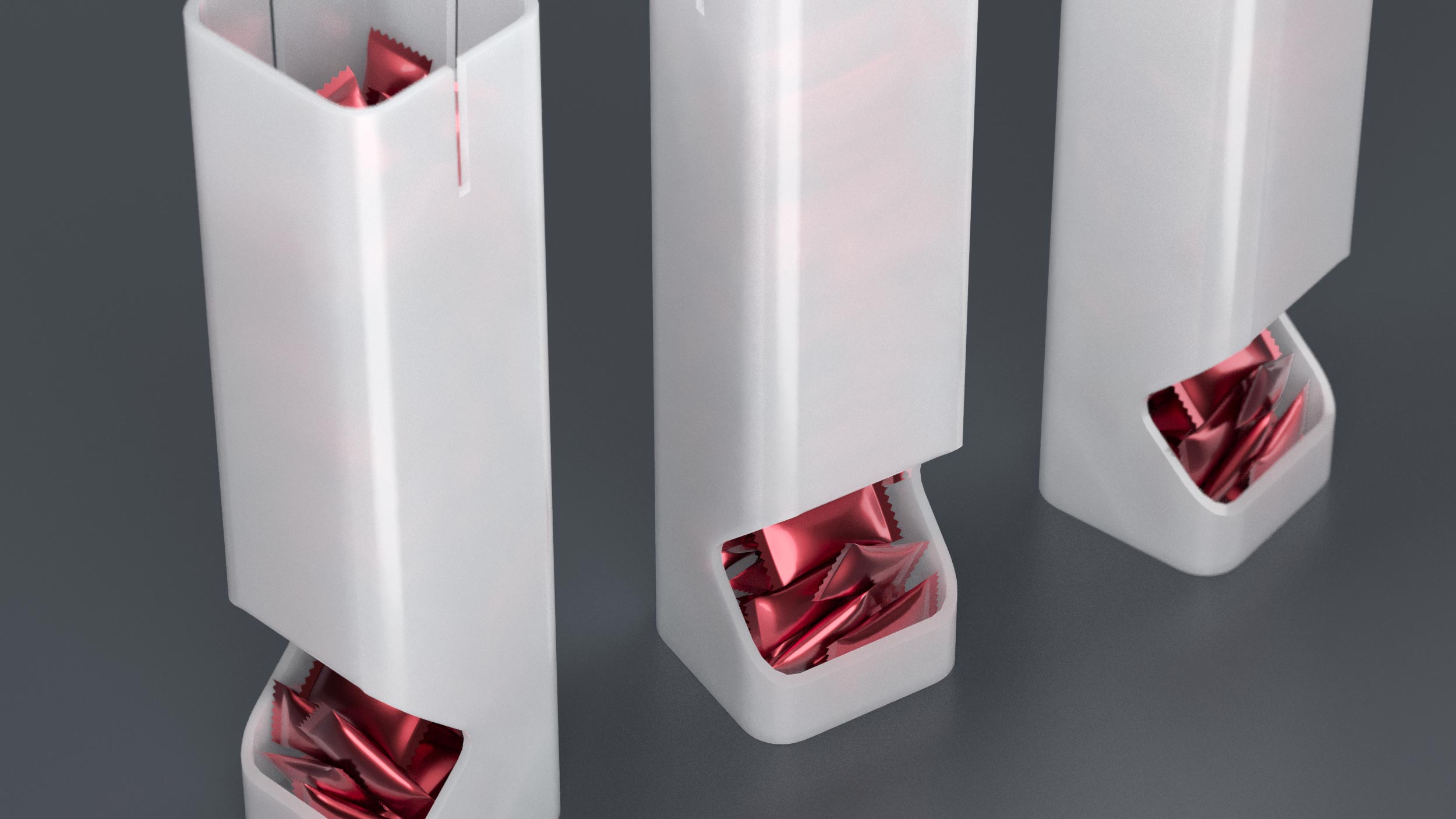The concept explores a modular point-of-sale display designed for single-serve products such as chewing gum and small impulse items.