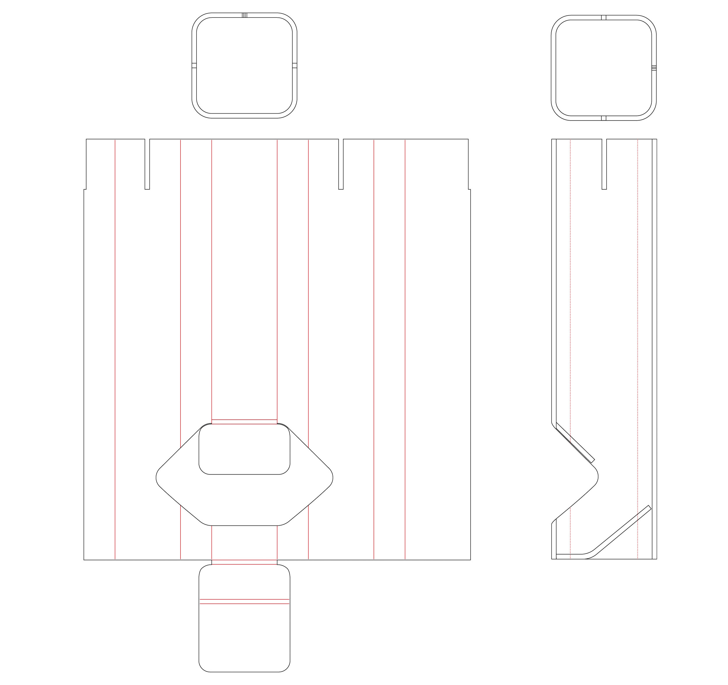 The system is based on a single folded element, conceived to work without visible glue points or complex assemblies. The structure relies mainly on material bending and precise geometries, with a minimal number of components and a clear production-oriented logic. A possible rear fixing was considered, to be evaluated with technical validation.